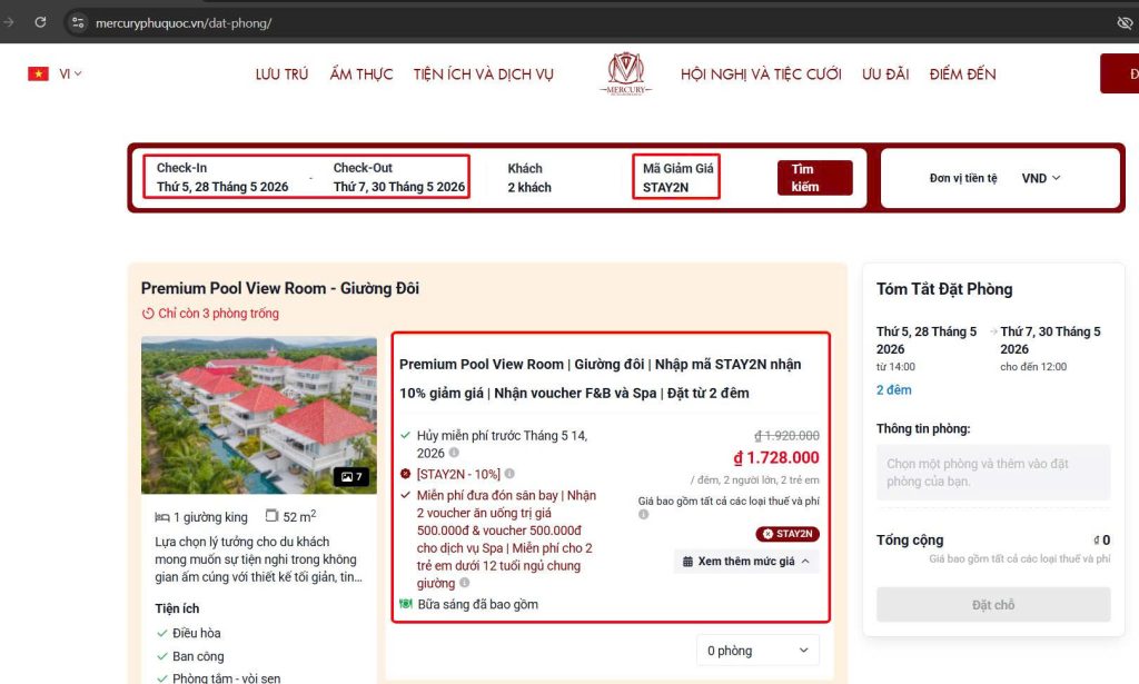 - Truy cập: https://mercuryphuquoc.vn/dat-phong/ chọn ngày lưu trú, tối thiểu 2 đêm, nhập mã giảm giá STAY2N, sau đó bấm nút TÌM KIẾM