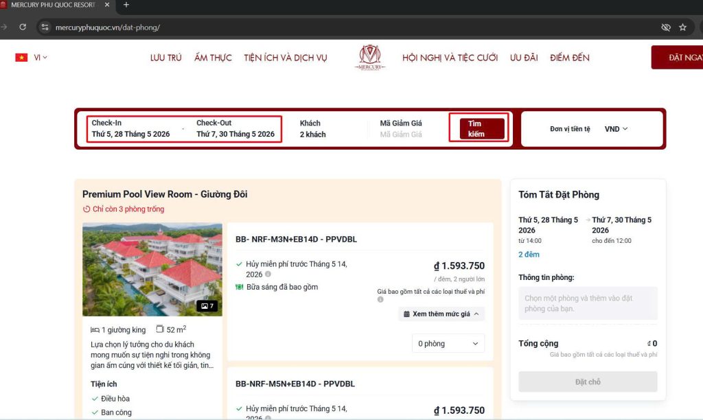 - Truy cập: https://mercuryphuquoc.vn/dat-phong/ chọn ngày lưu trú, tối thiểu 2 đêm, sau đó bấm nút TÌM KIẾM