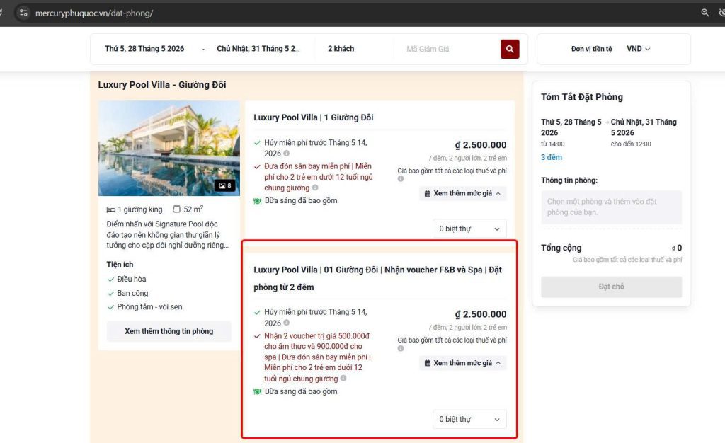 - Chọn gói giá “có ghi kèm ưu đãi”, chọn số lượng villa muốn đặt